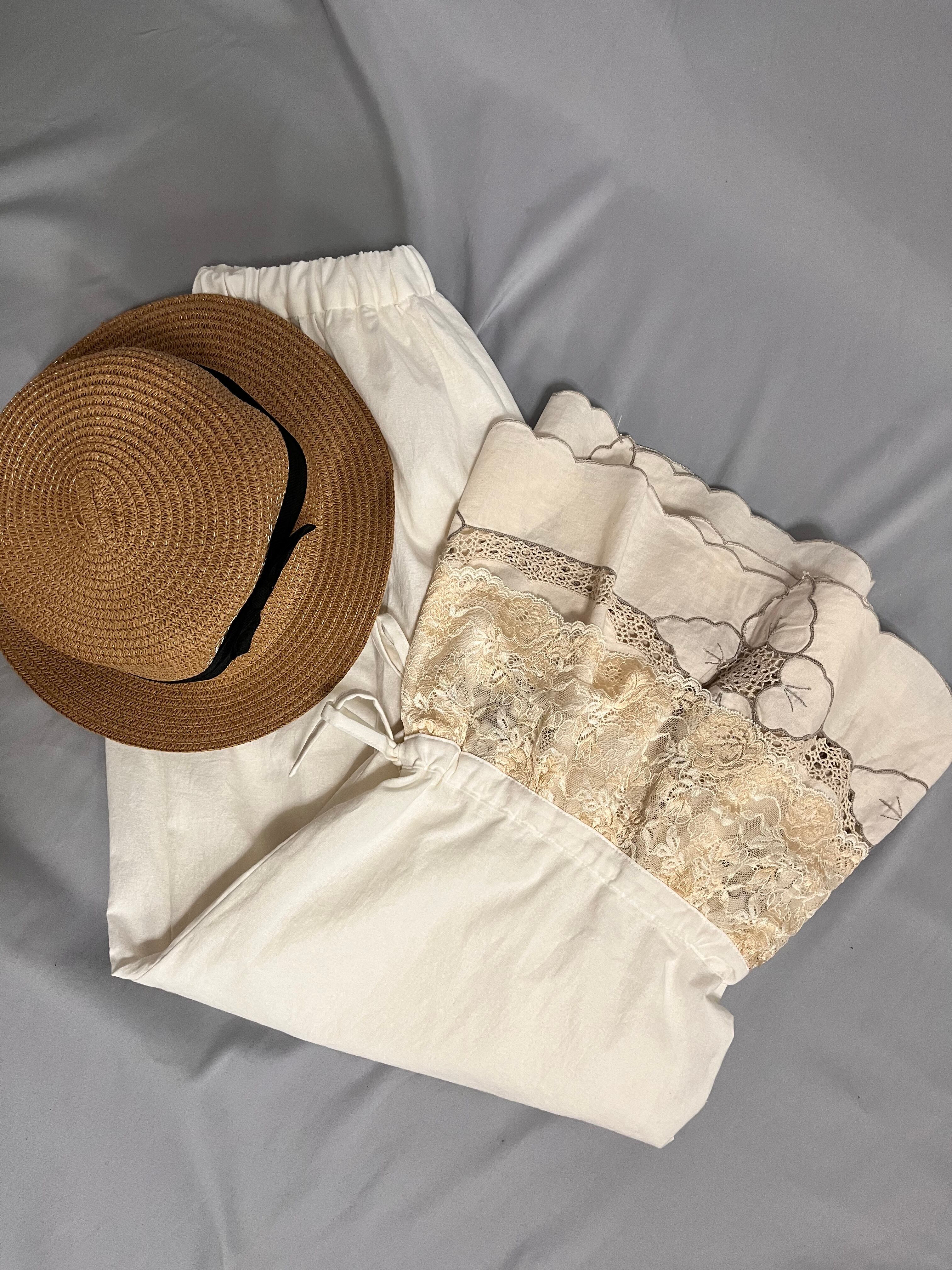 コットンリネンのくったりとした風合いに、裾には存在感たっぷりのアンティークレースを贅沢に使用