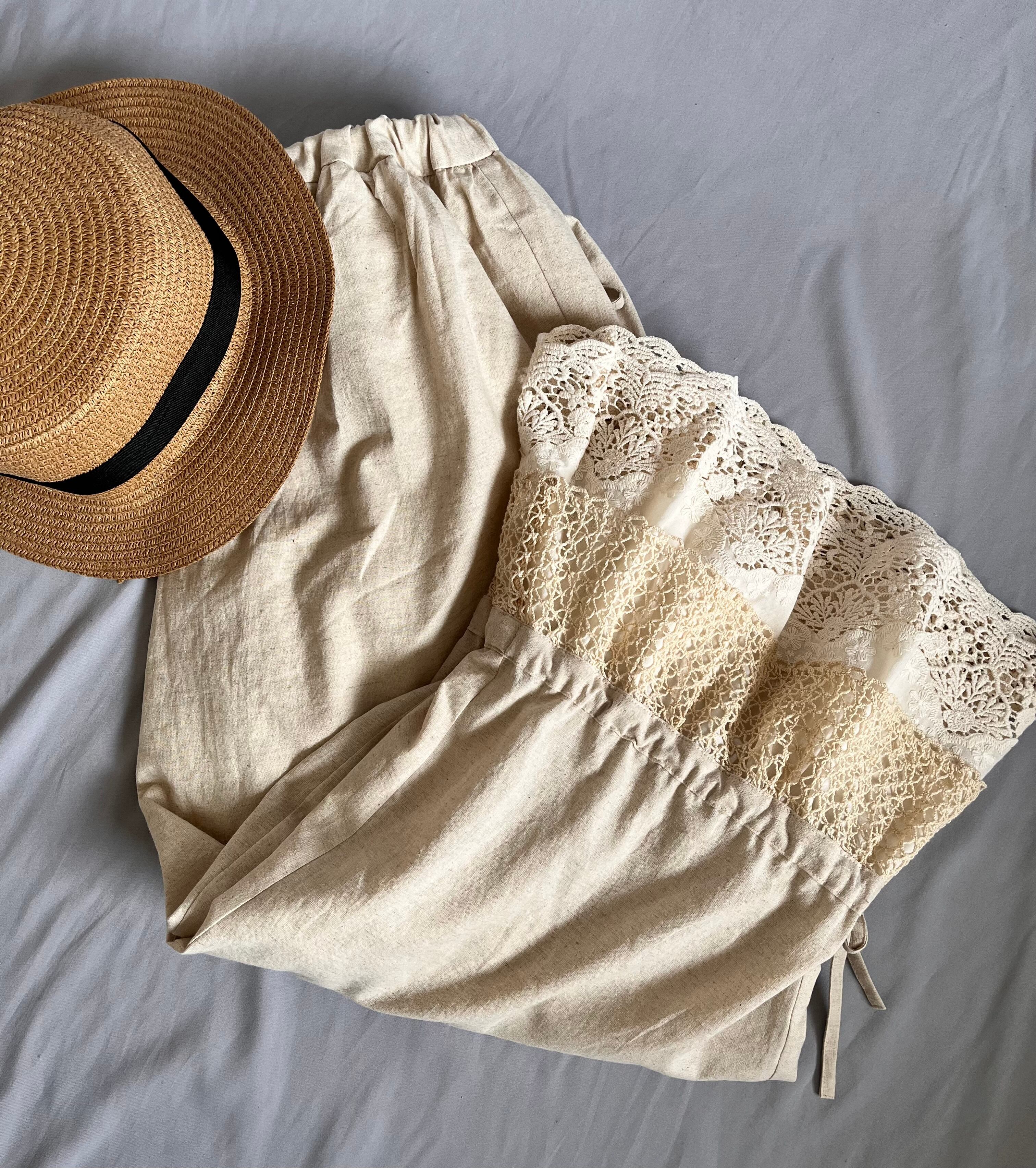 コットンリネンのくったりとした風合いに、裾には存在感たっぷりのアンティークレースを贅沢に使用