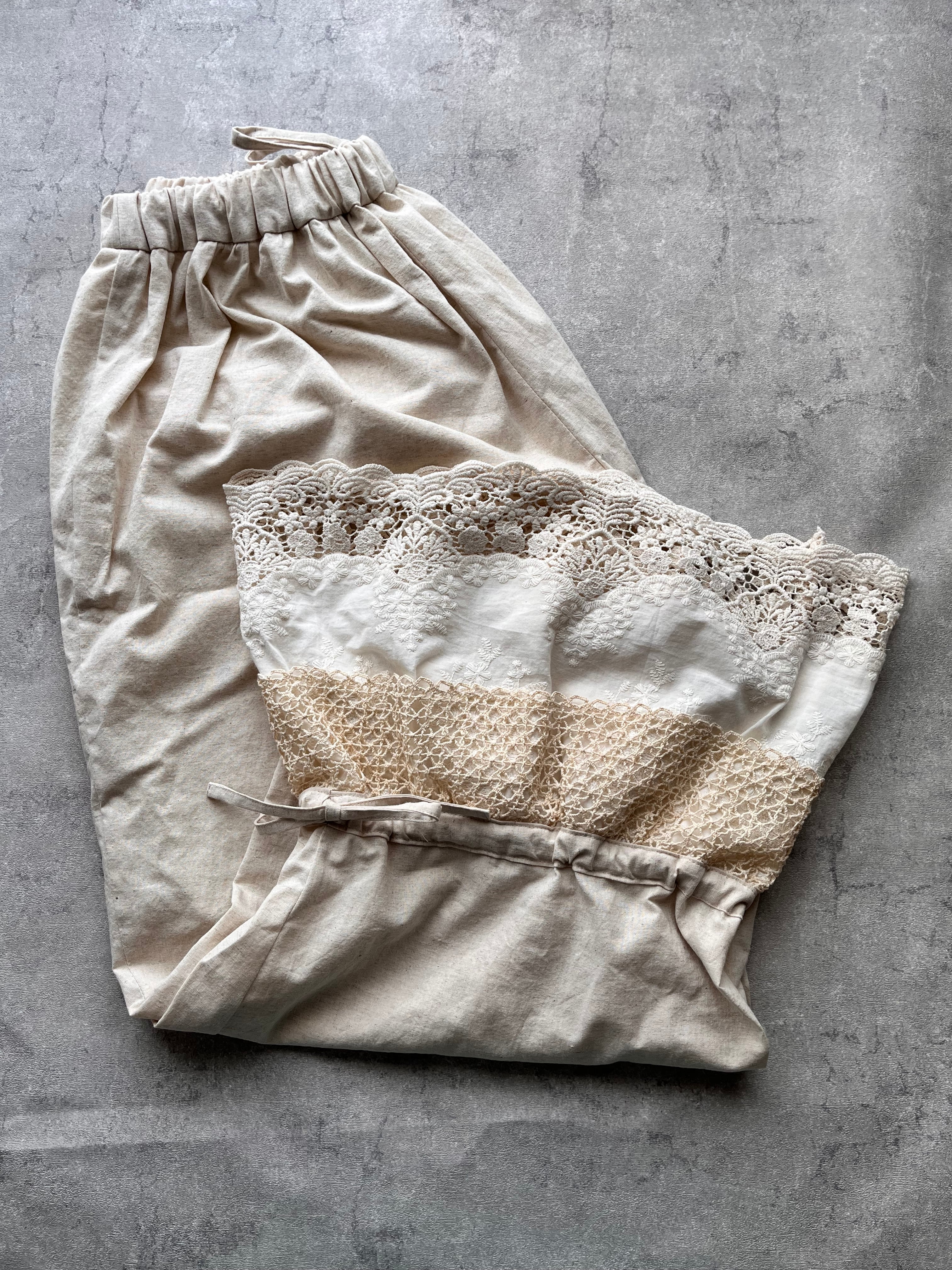 コットンリネンのくったりとした風合いに、裾には存在感たっぷりのアンティークレースを贅沢に使用