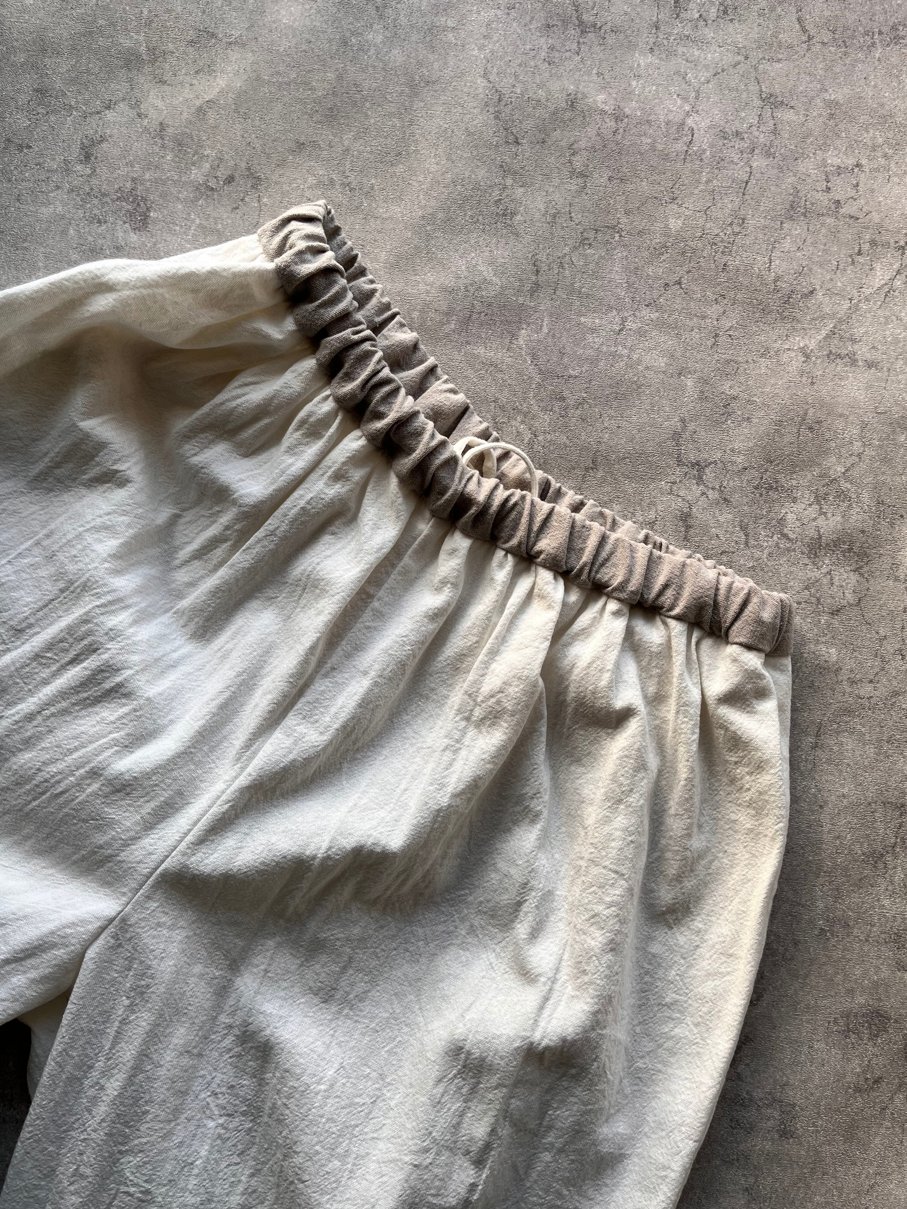 裾には紐付きのギャザー調整機能つきで、お好みのシルエットにアレンジ可能。ウエストはひも仕様で幅広いサイズに対応します。