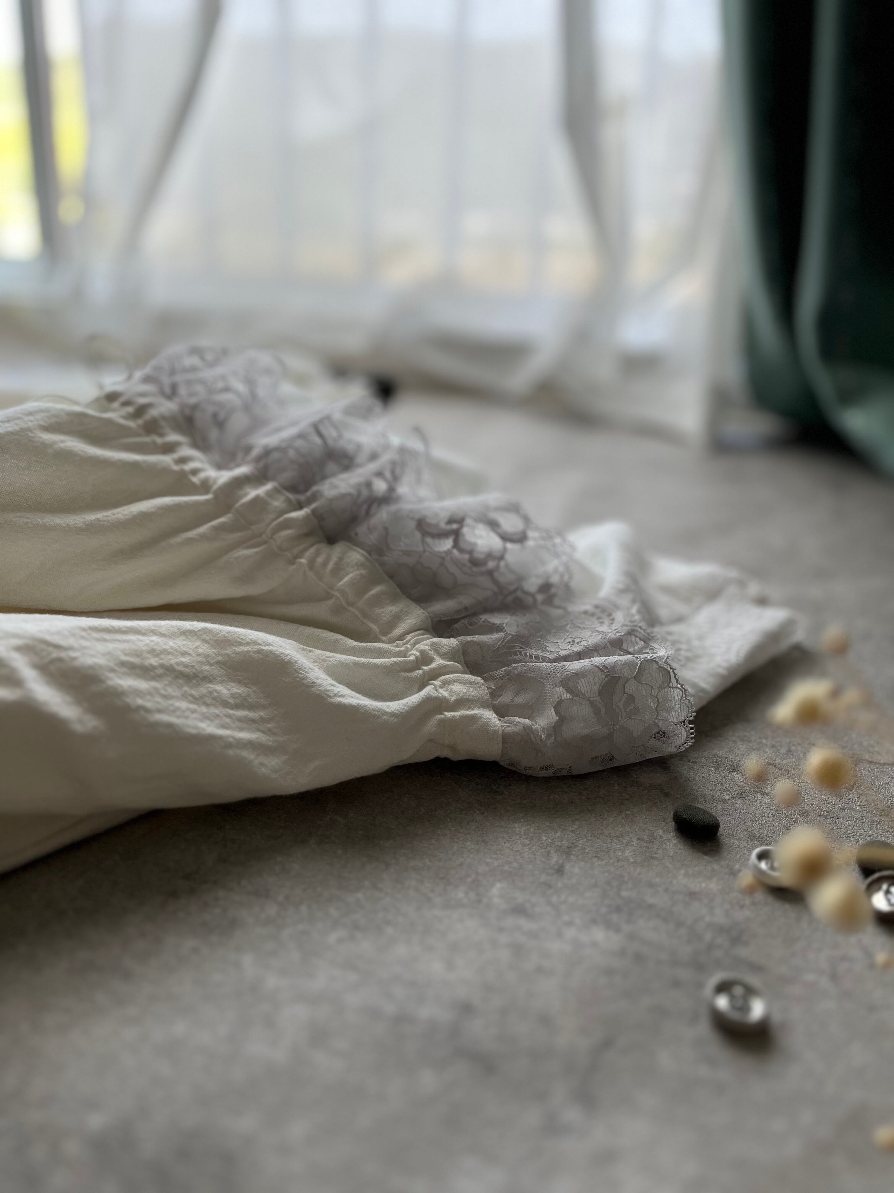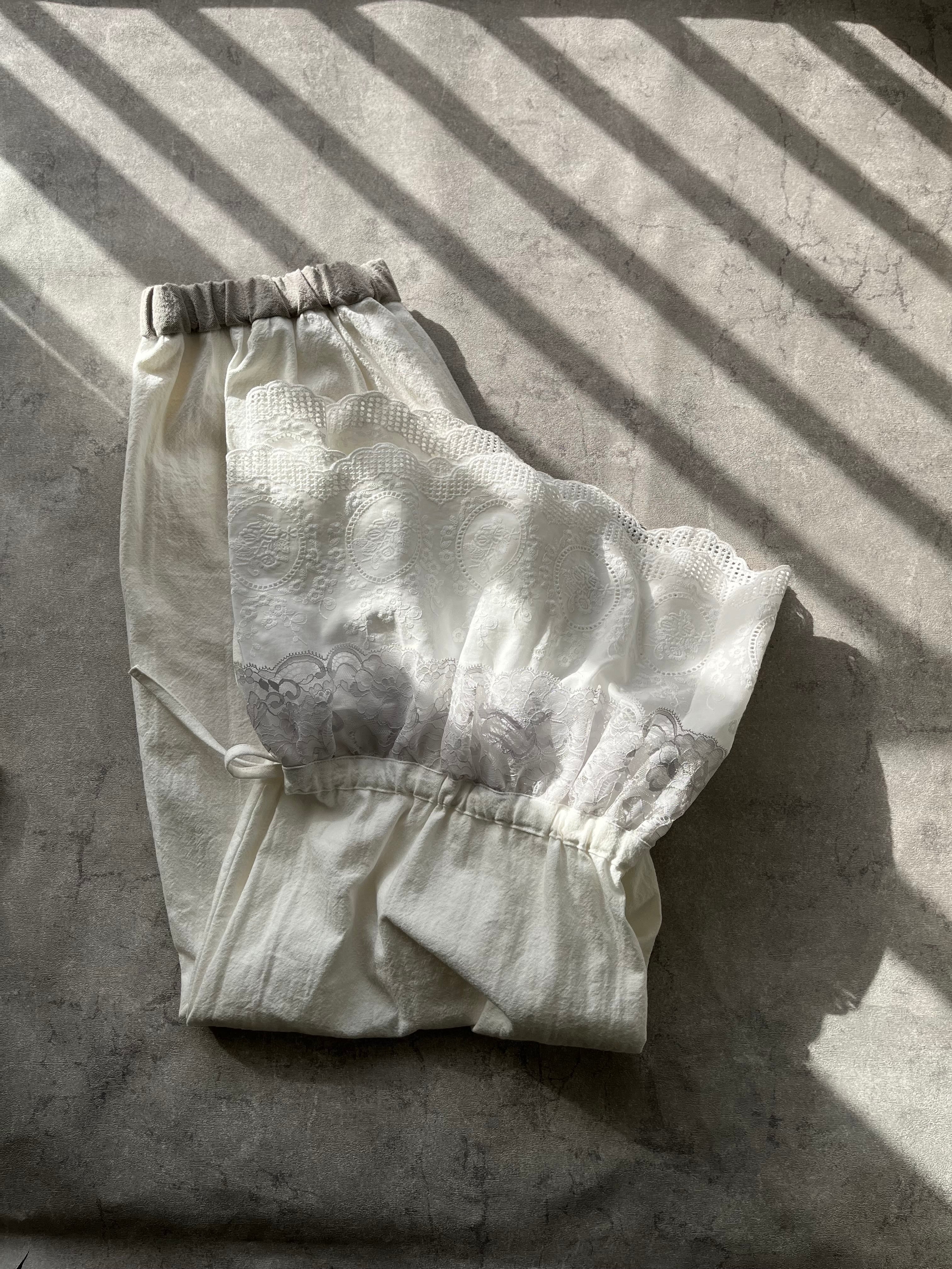 コットンリネンのくったりとした風合いに、裾には存在感たっぷりのアンティークレースを贅沢に使用
