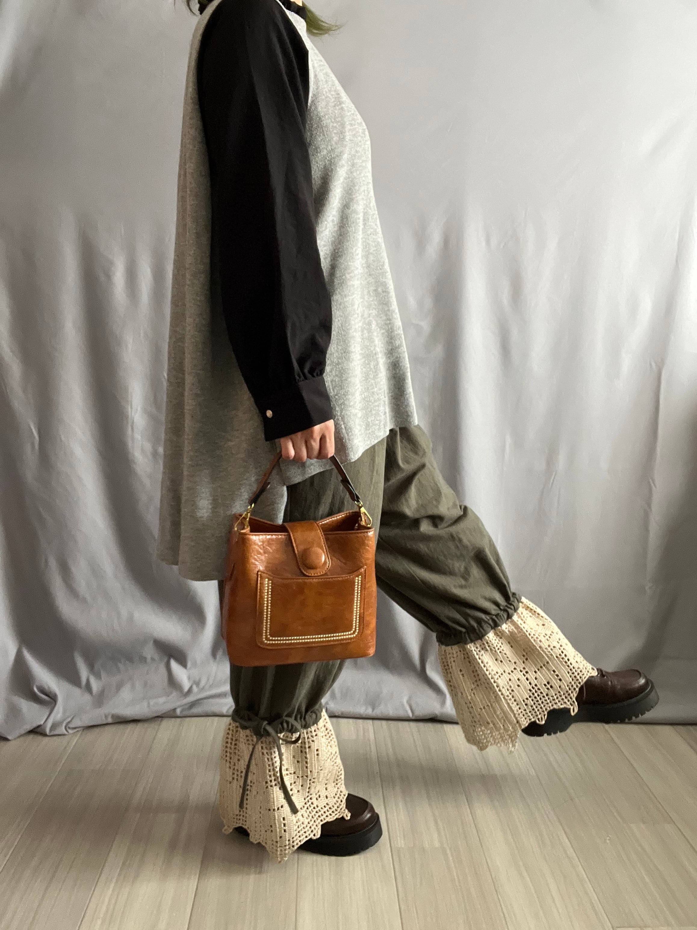 裾には紐付きのギャザー調整機能つきで、お好みのシルエットにアレンジ可能。ウエストはひも仕様で幅広いサイズに対応します。