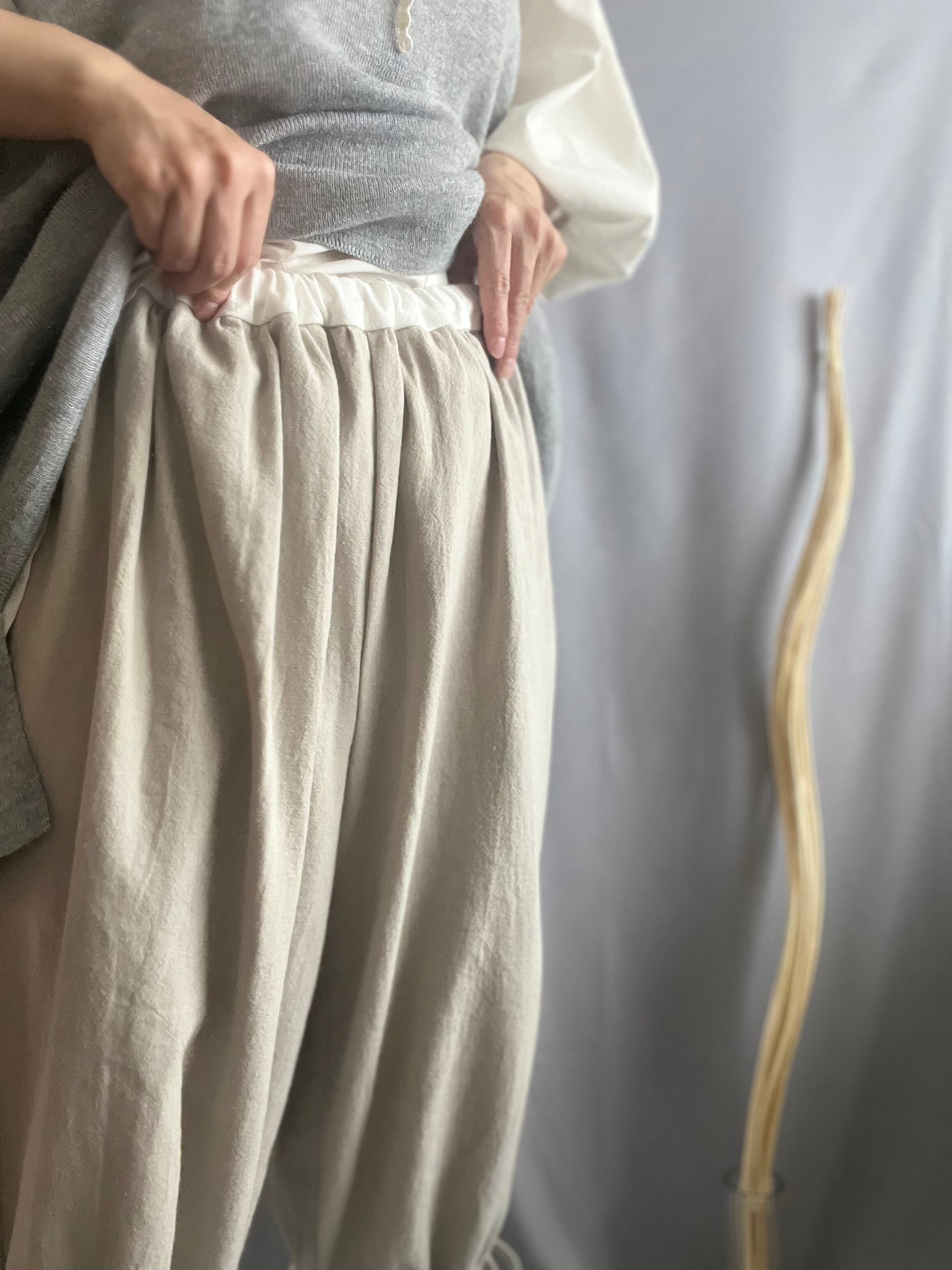 裾には紐付きのギャザー調整機能つきで、お好みのシルエットにアレンジ可能。ウエストはひも仕様で幅広いサイズに対応します。