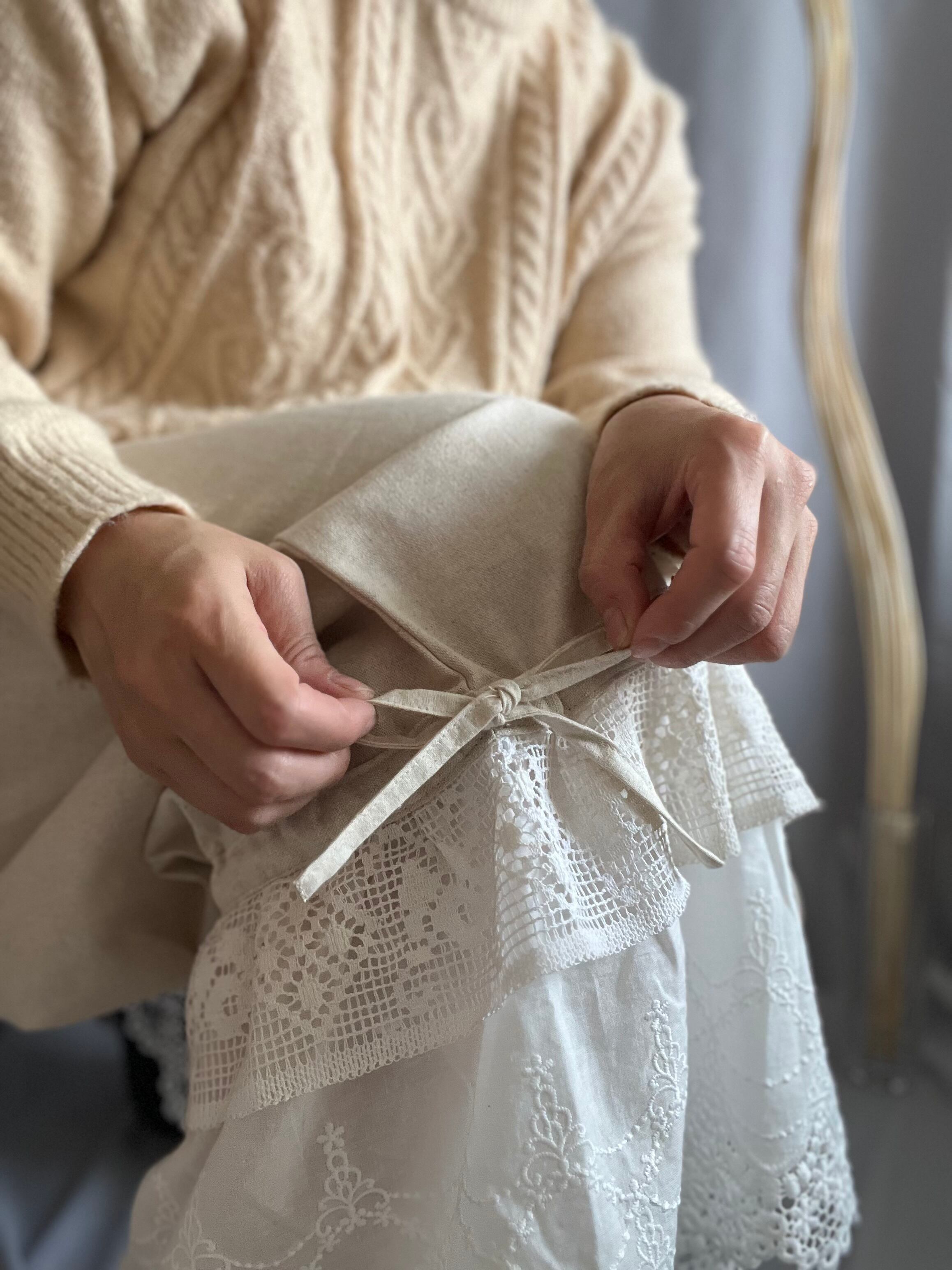 コットンリネンのくったりとした風合いに、裾には存在感たっぷりのアンティークレースを贅沢に使用