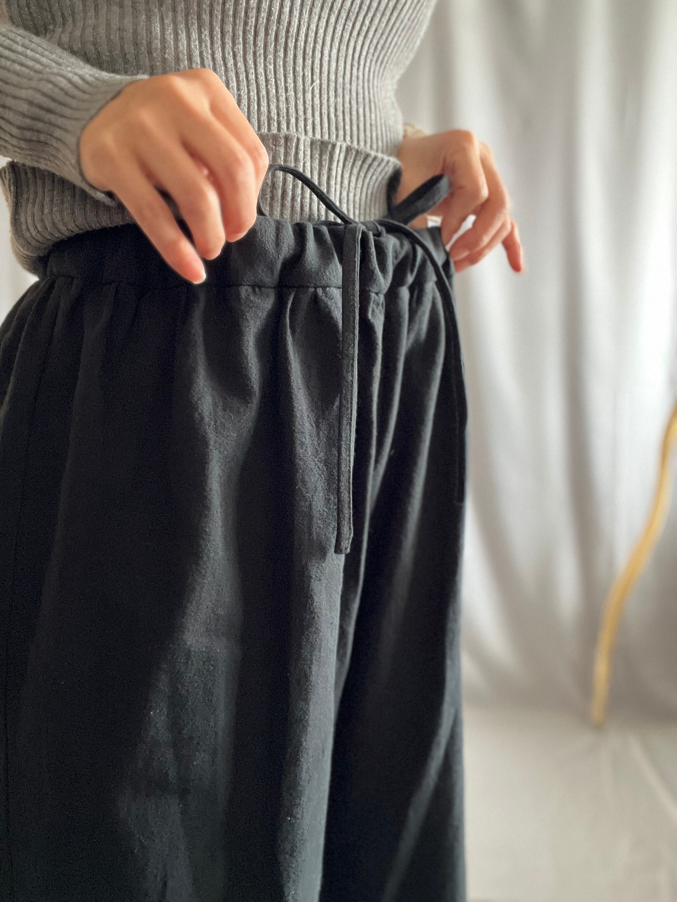 裾には紐付きのギャザー調整機能つきで、お好みのシルエットにアレンジ可能。ウエストはひも仕様で幅広いサイズに対応します。