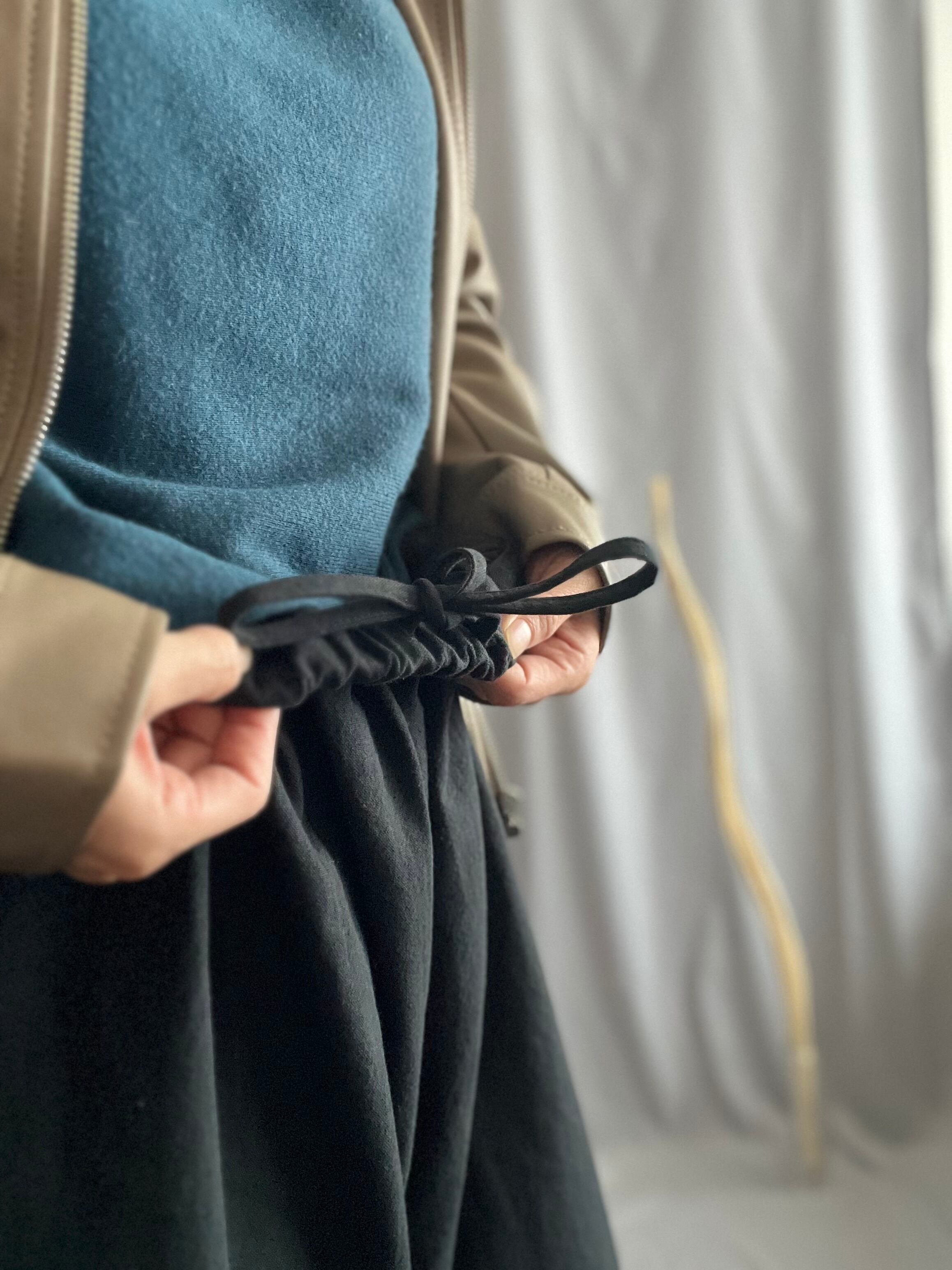 裾には紐付きのギャザー調整機能つきで、お好みのシルエットにアレンジ可能。ウエストはひも仕様で幅広いサイズに対応します。