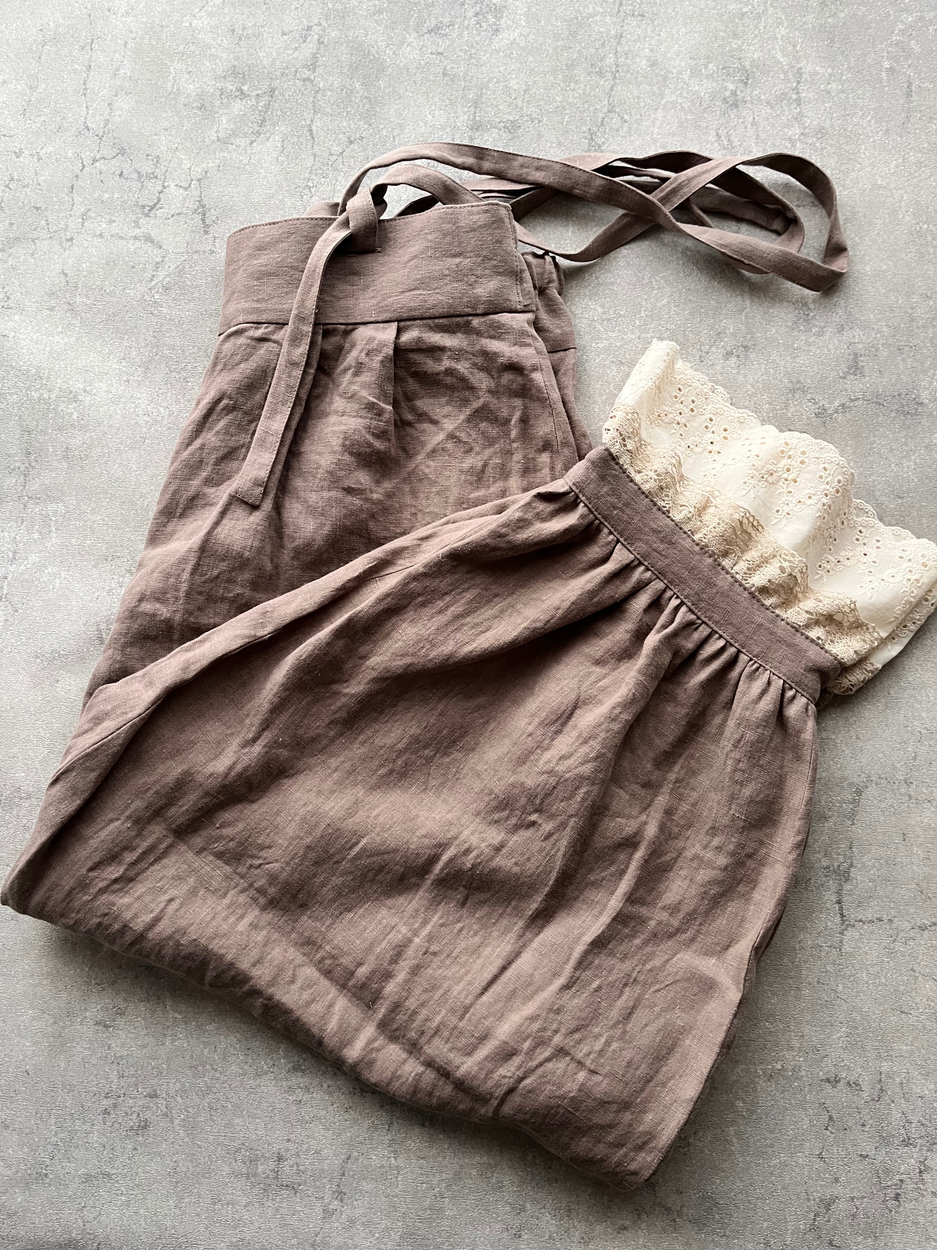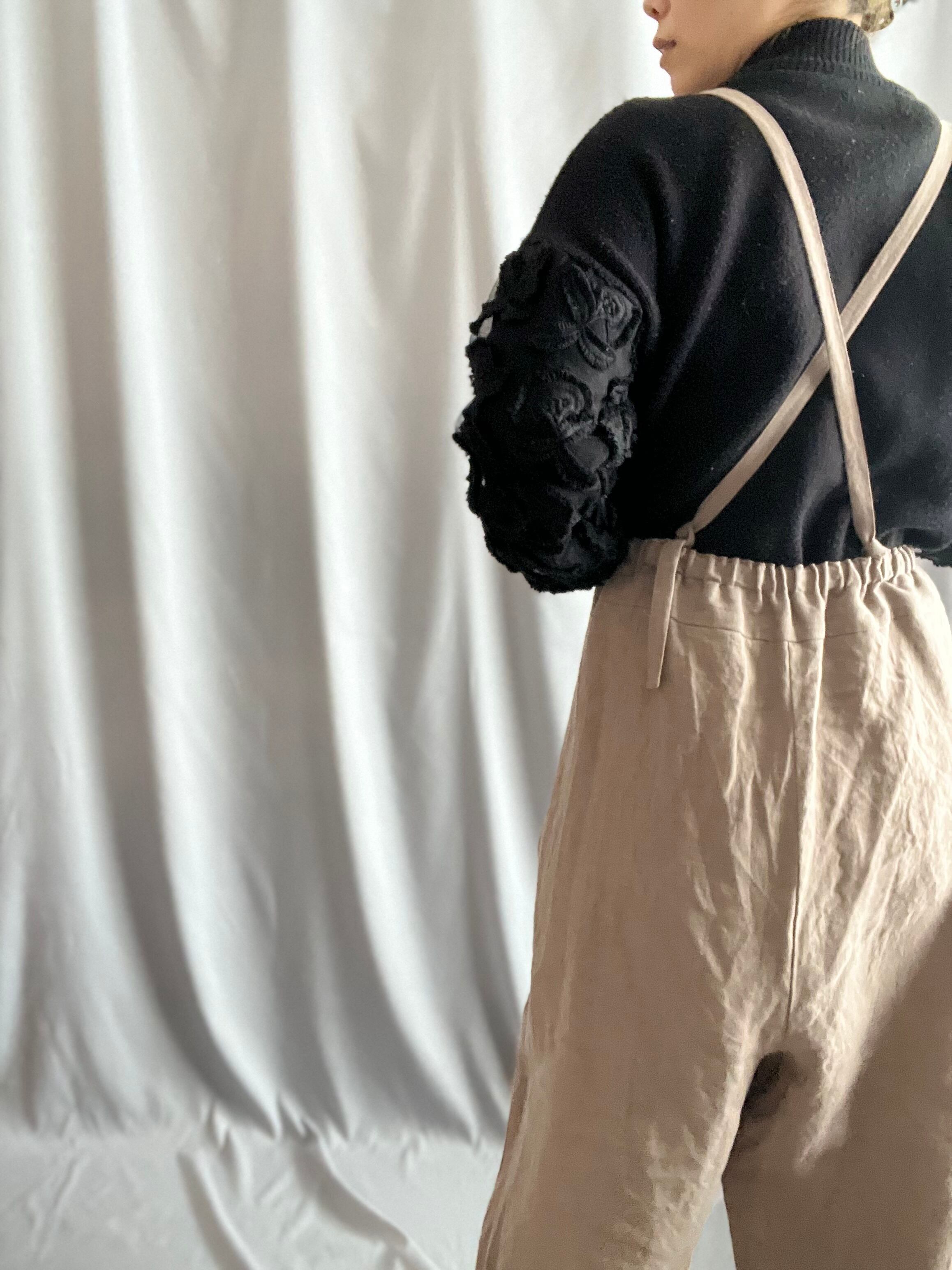 シンプルでありながら目を引く、こだわりの肩紐付きドロワーズパンツ