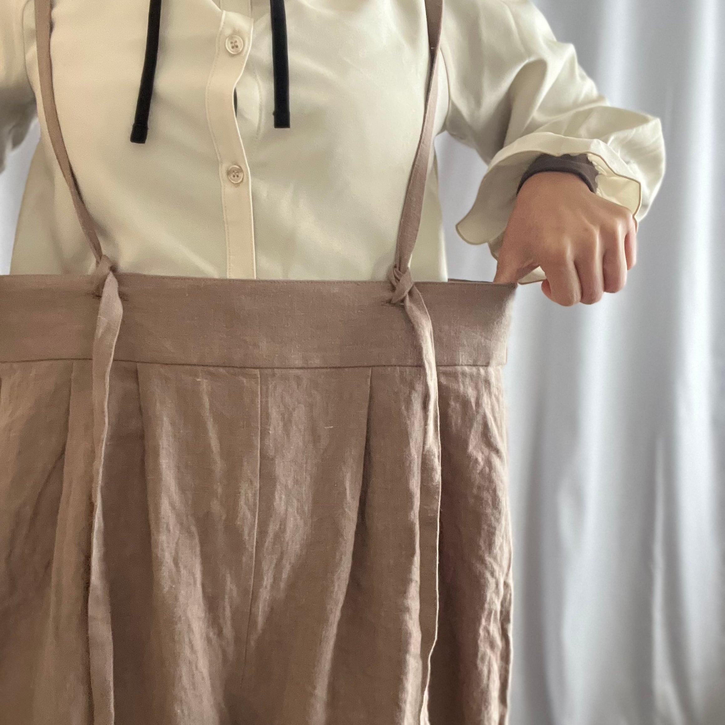 シンプルでありながら目を引く、こだわりの肩紐付きドロワーズパンツ