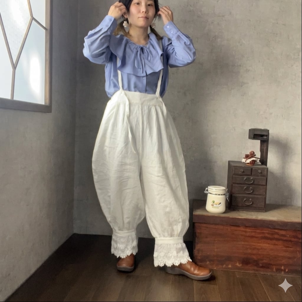 シンプルでありながら目を引く、こだわりの肩紐付きドロワーズパンツ