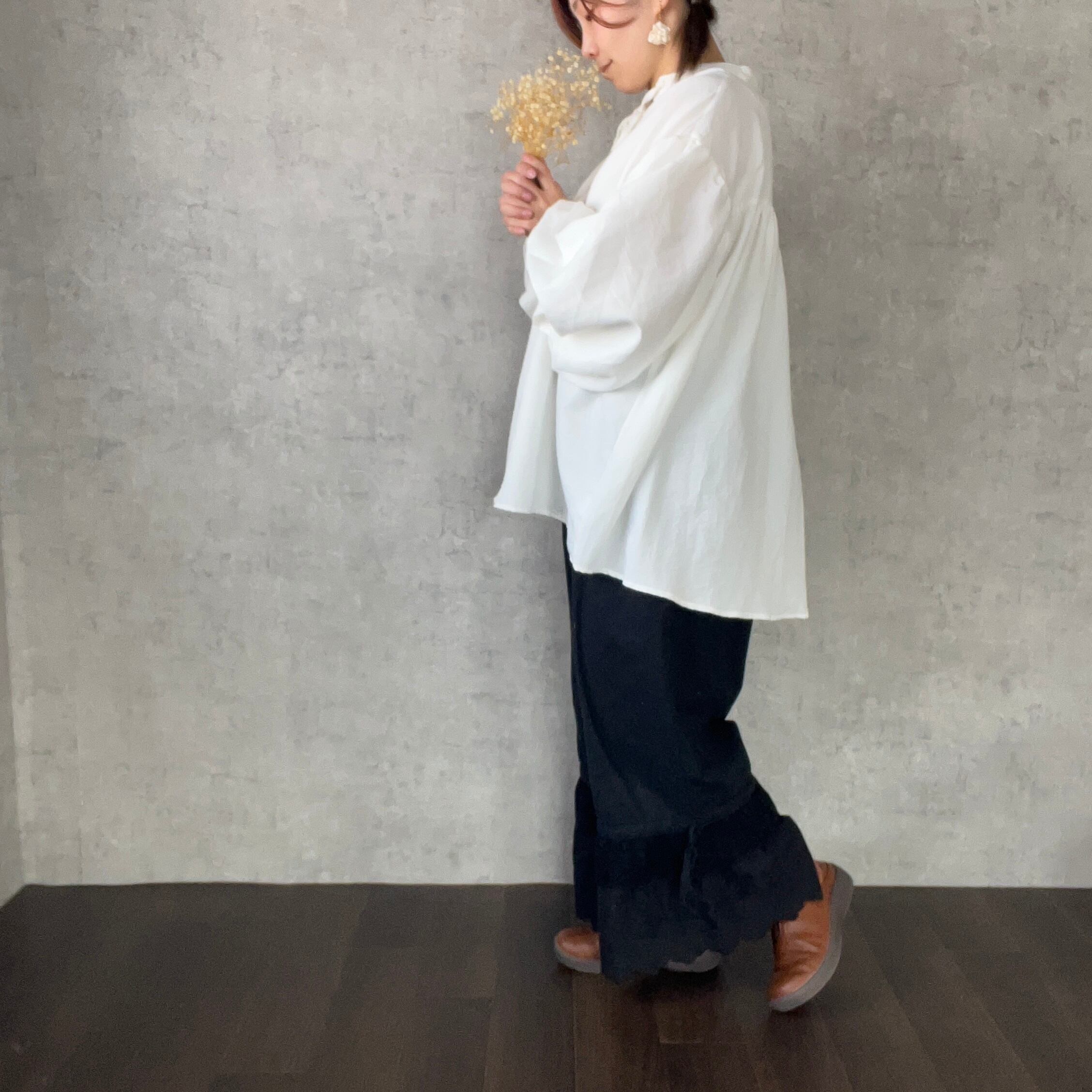 裾には紐付きのギャザー調整機能つきで、お好みのシルエットにアレンジ可能。ウエストはひも仕様で幅広いサイズに対応します。